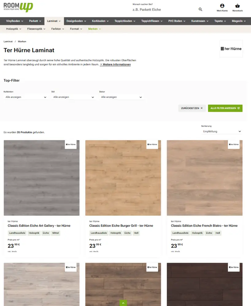 * Inbegriffen sind Produkte der Marken: Associated Weavers, Bennett & Jones, Haro, Kährs, Lano, Moduleo, Parador, Quickstep, Tarkett, ter Hürne, tretford, Vorwerk Das Teppichwerk, Wineo, Ziro. Weitere Marken & Produkte auf Anfrage möglich.